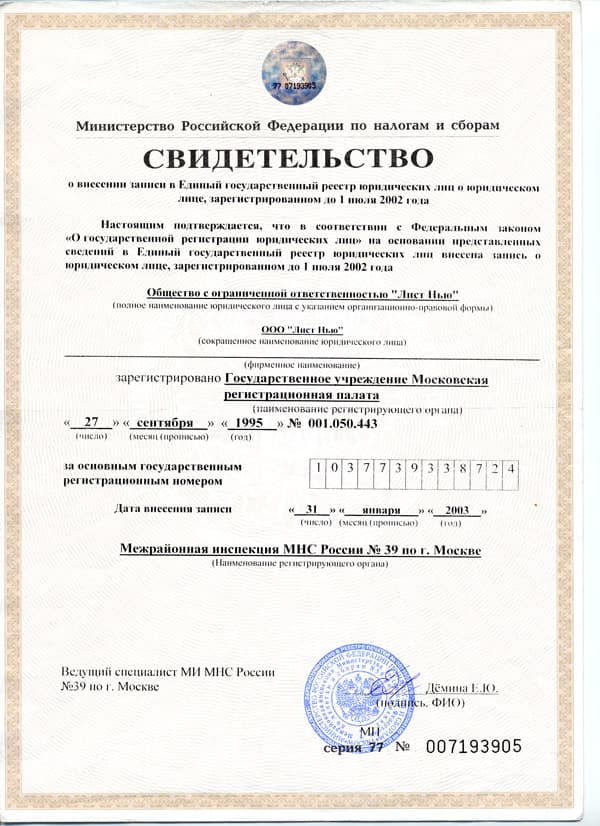 Дата регистрации: 27 сентября 1995 г посмотреть св-во о регистрации